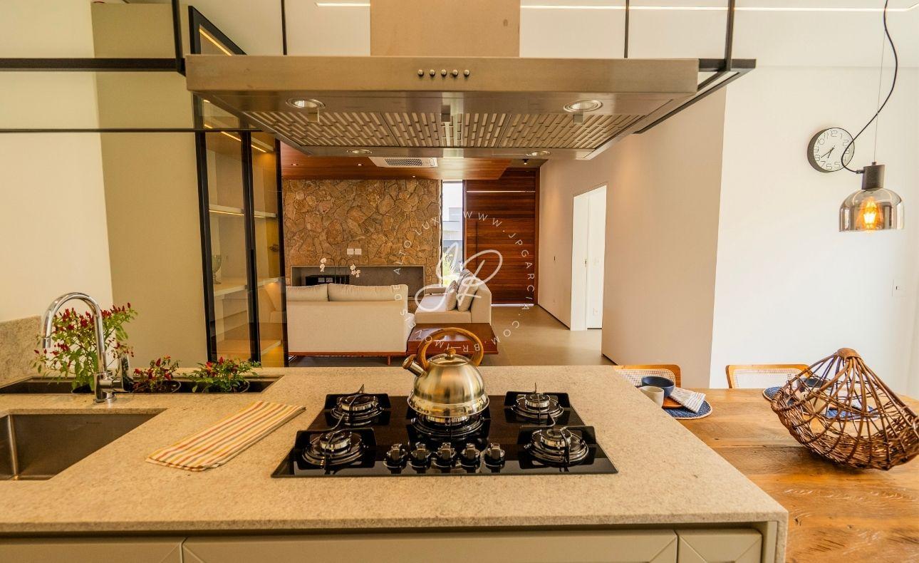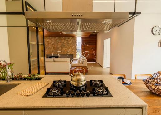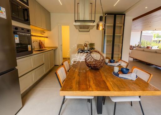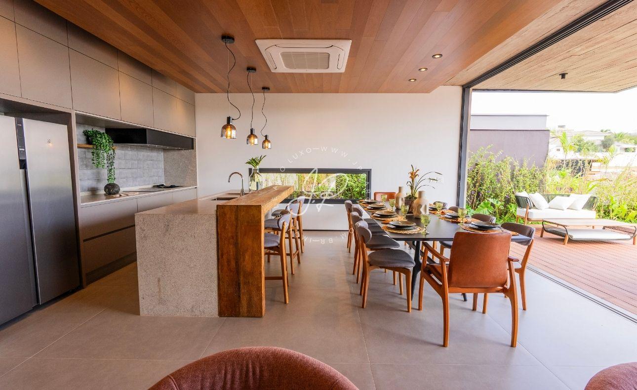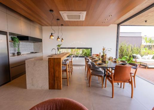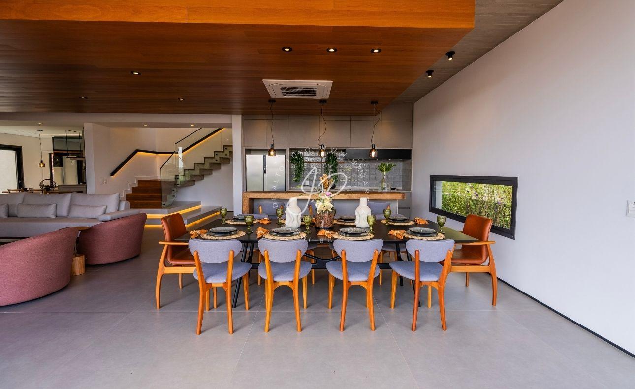 O living amplo com lareira integra-se à varanda gourmet, proporcionando convivência acolhedora e fluida entre os ambientes. Dispõe ainda de lavabo, home office, cozinha equipada com despensa e área de serviços.