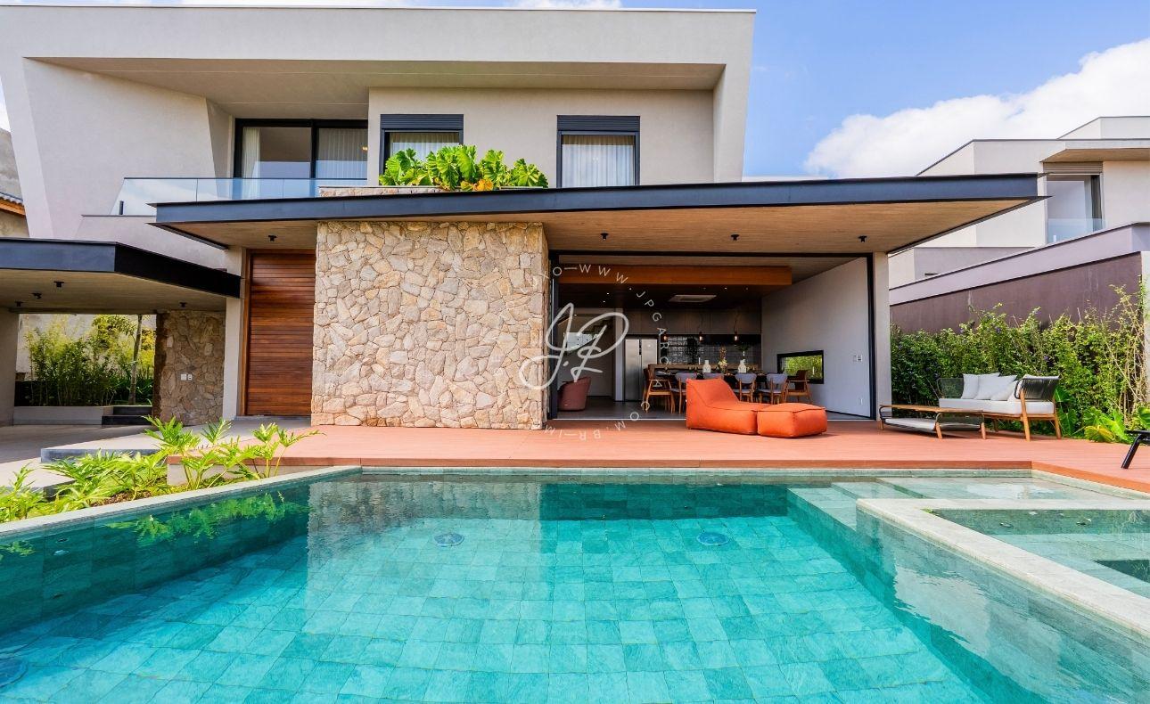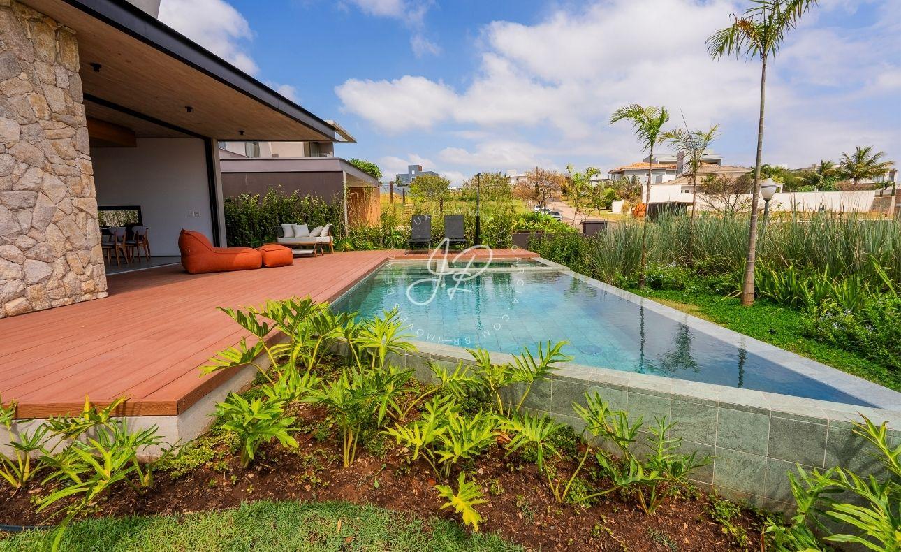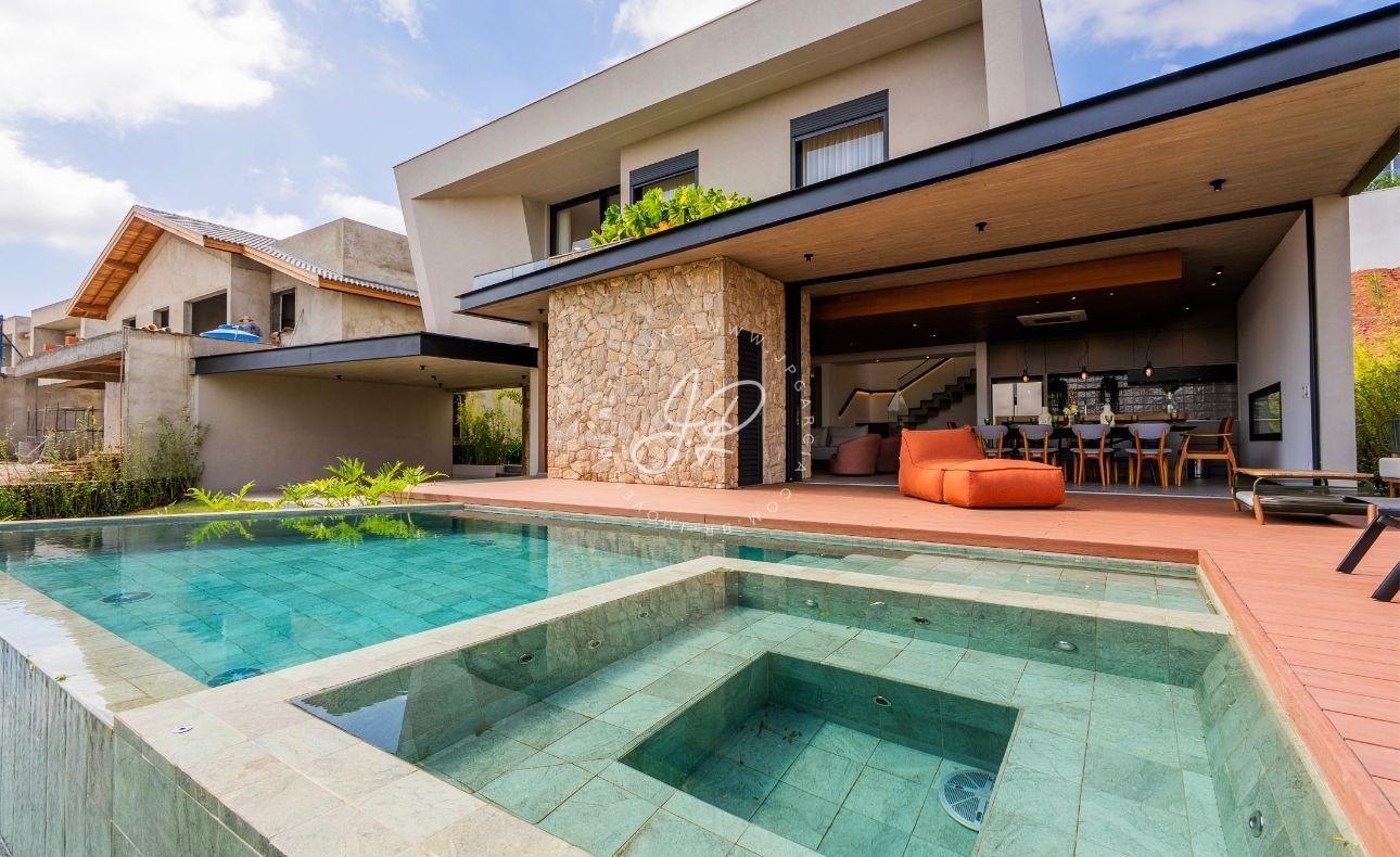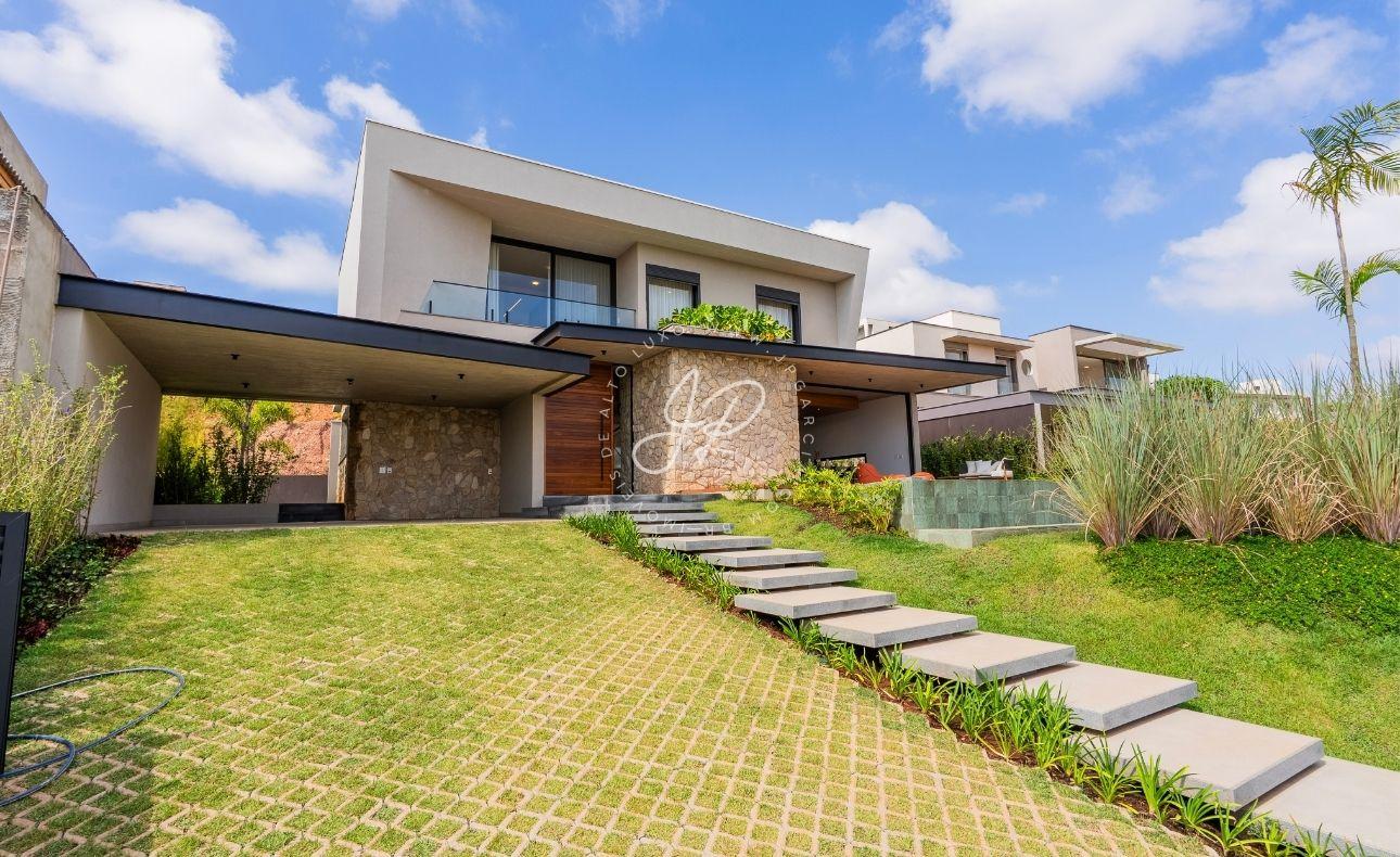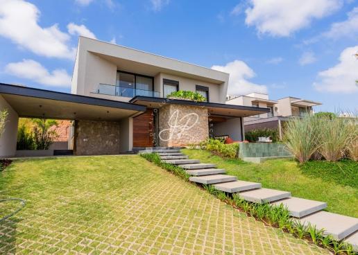 Para o lazer, piscina com prainha, quintal gramado que circunda a casa e espaço gourmet completo. Conta ainda com 4 vagas (2 cobertas), infraestrutura para ar condicionado e aquecimento solar.