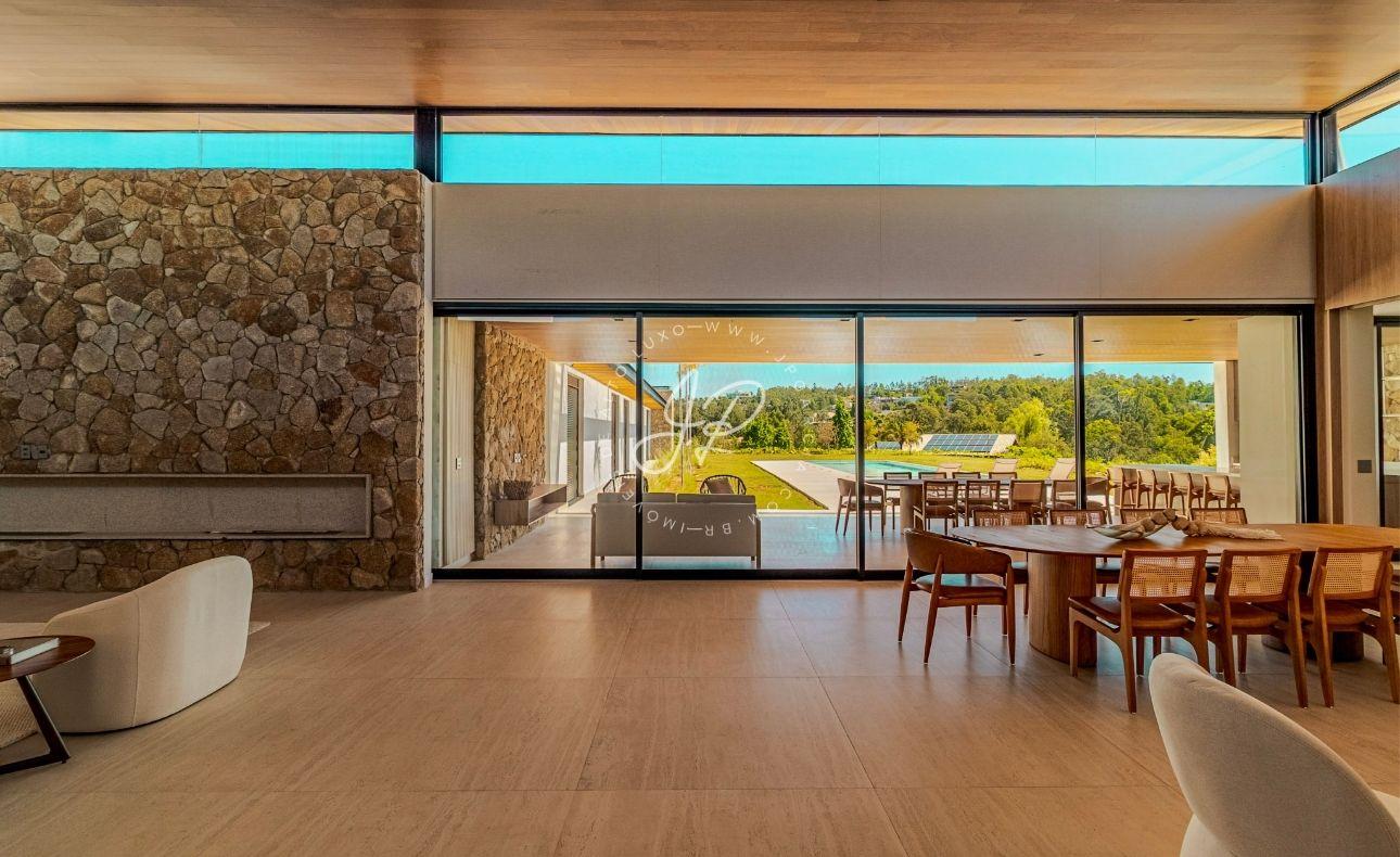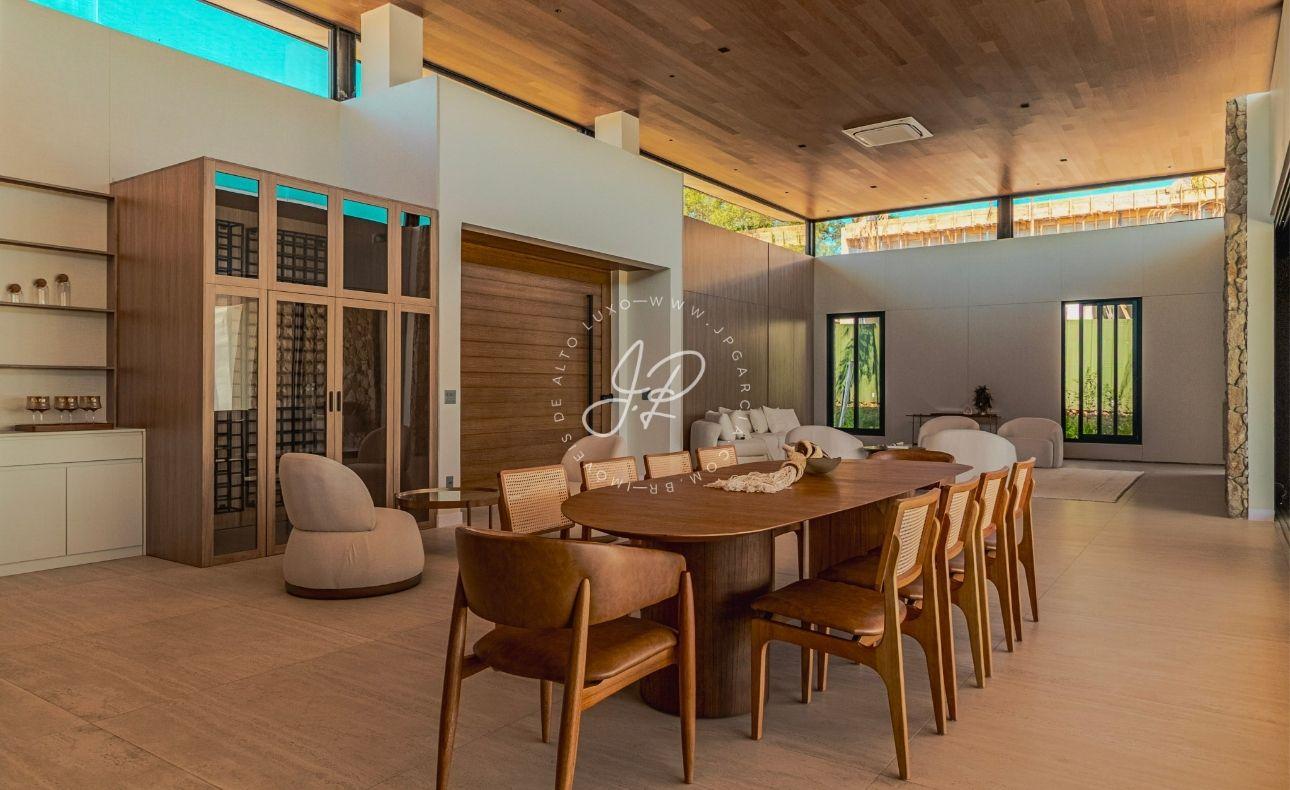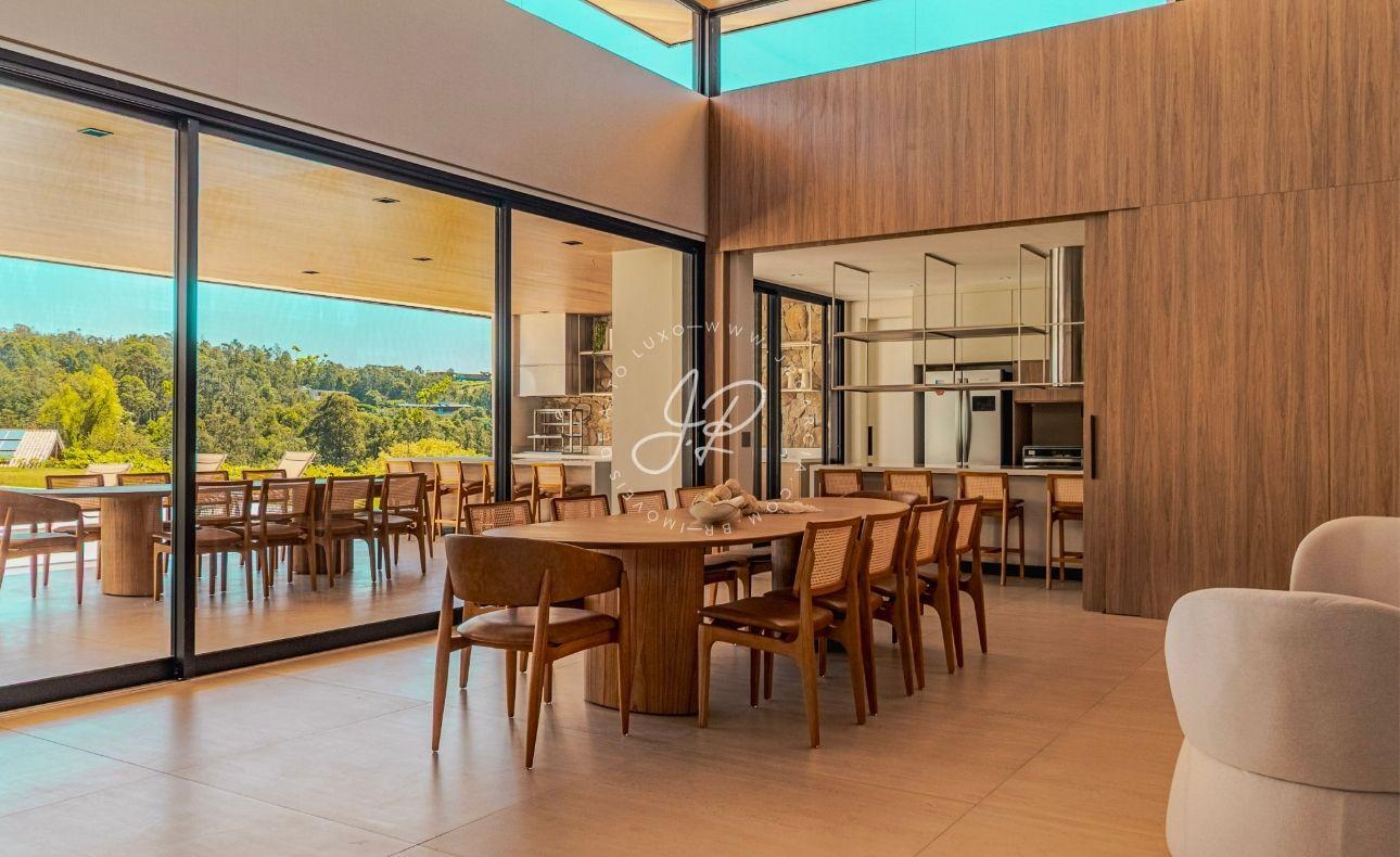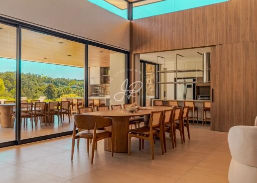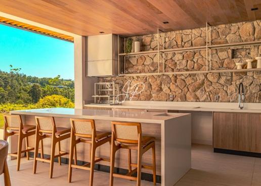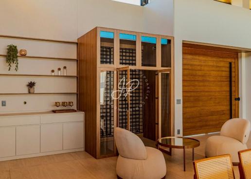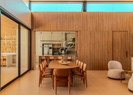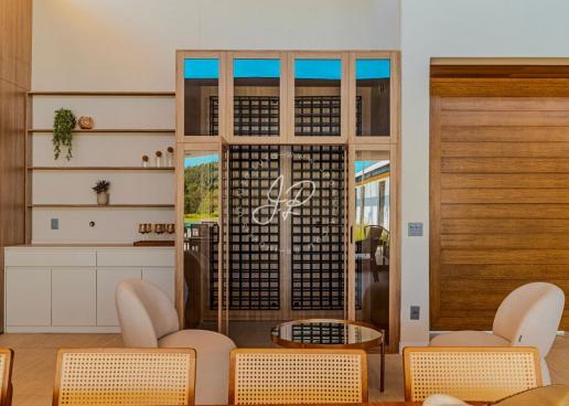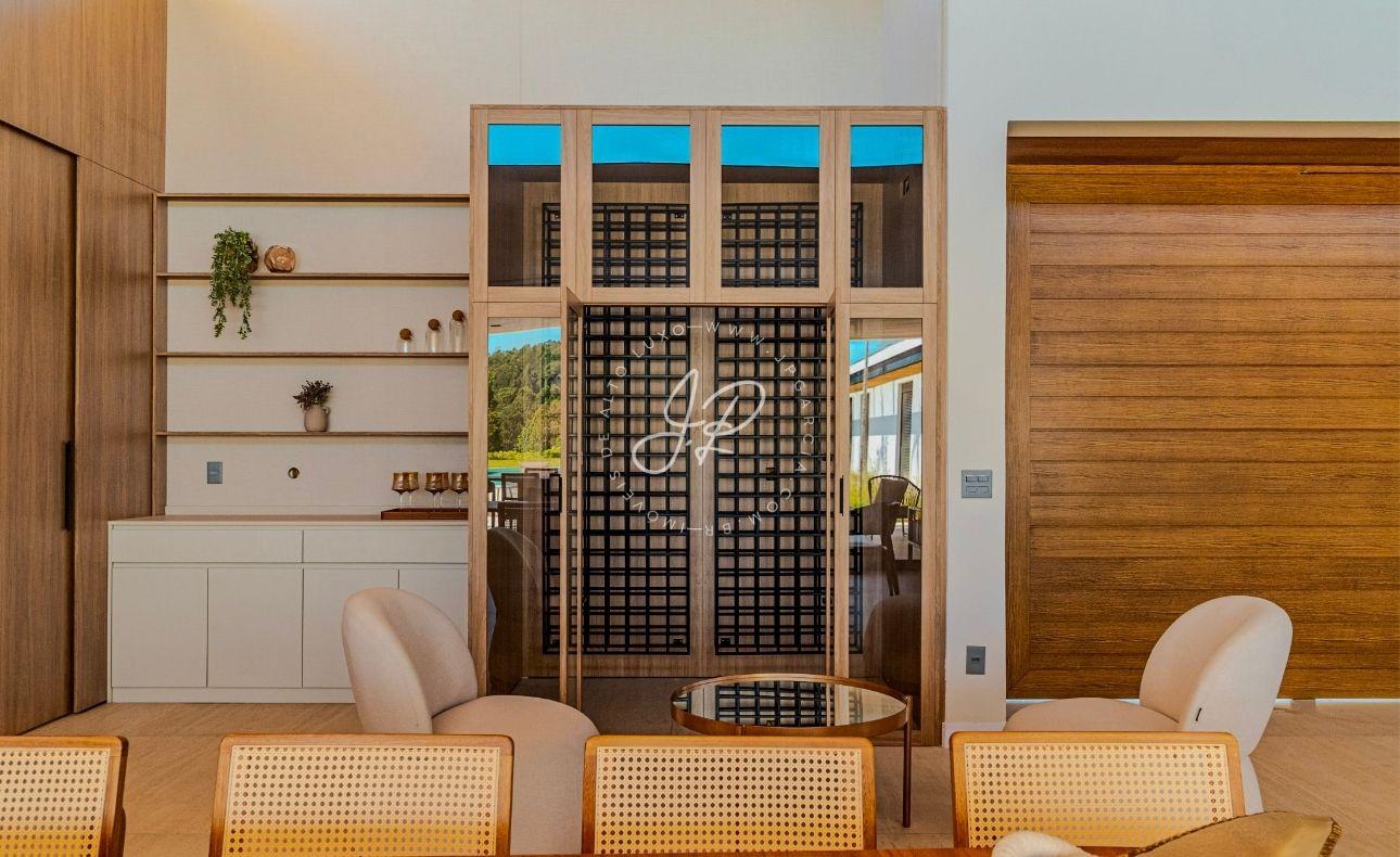Ao entrar, a vista para o verde e o paisagismo de Roberto Riscalla já encantam. O hall possui pé-direito duplo e acabamento em madeira, criando um ambiente acolhedor. A casa conta com adega climatizada para mais de 300 garrafas, cozinha e espaço gourmet que podem ser integrados ao living e à sala de jantar, ideais para receber com naturalidade.