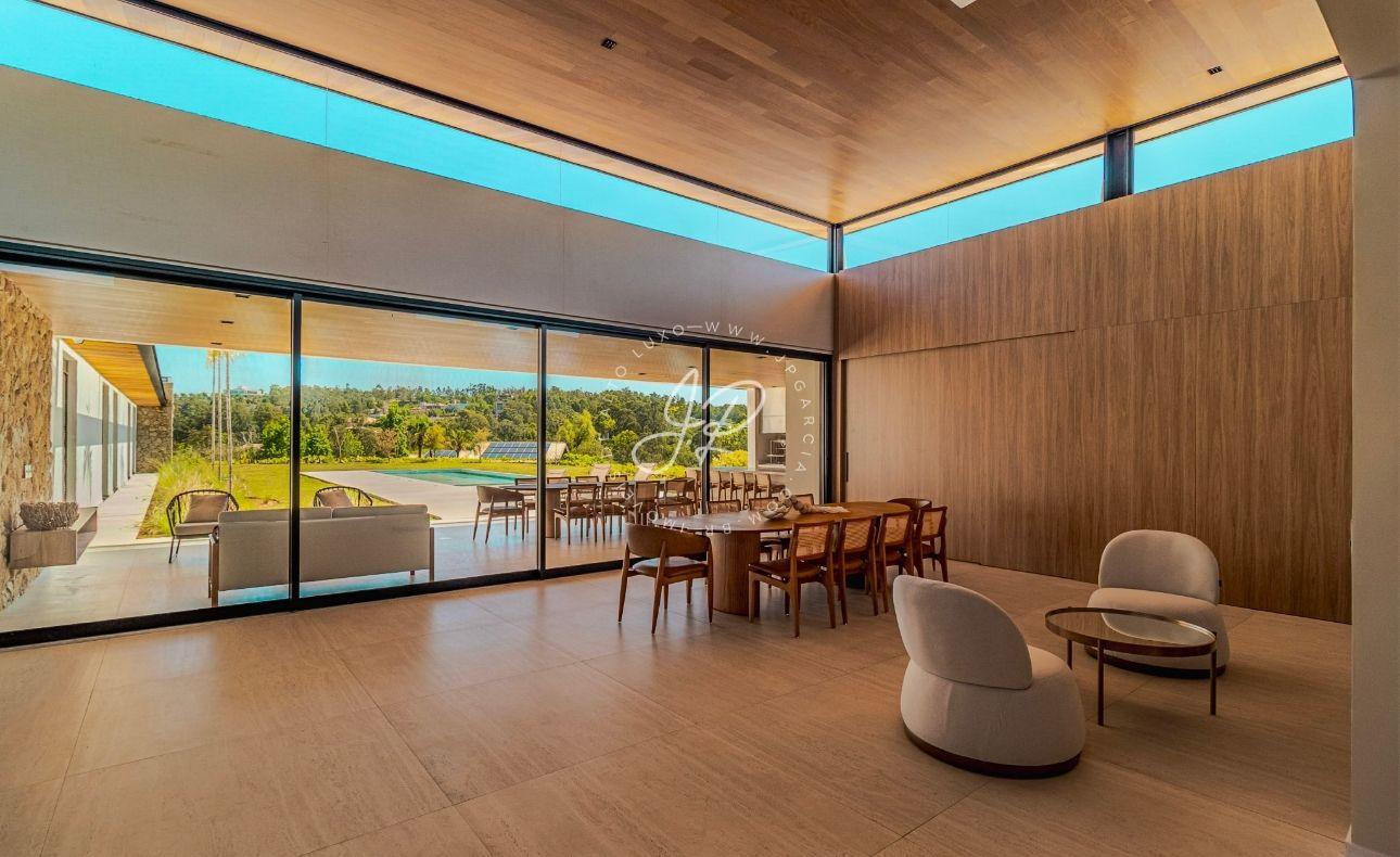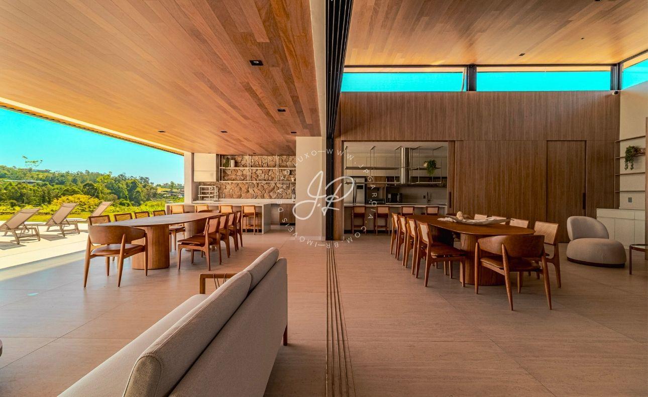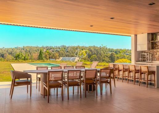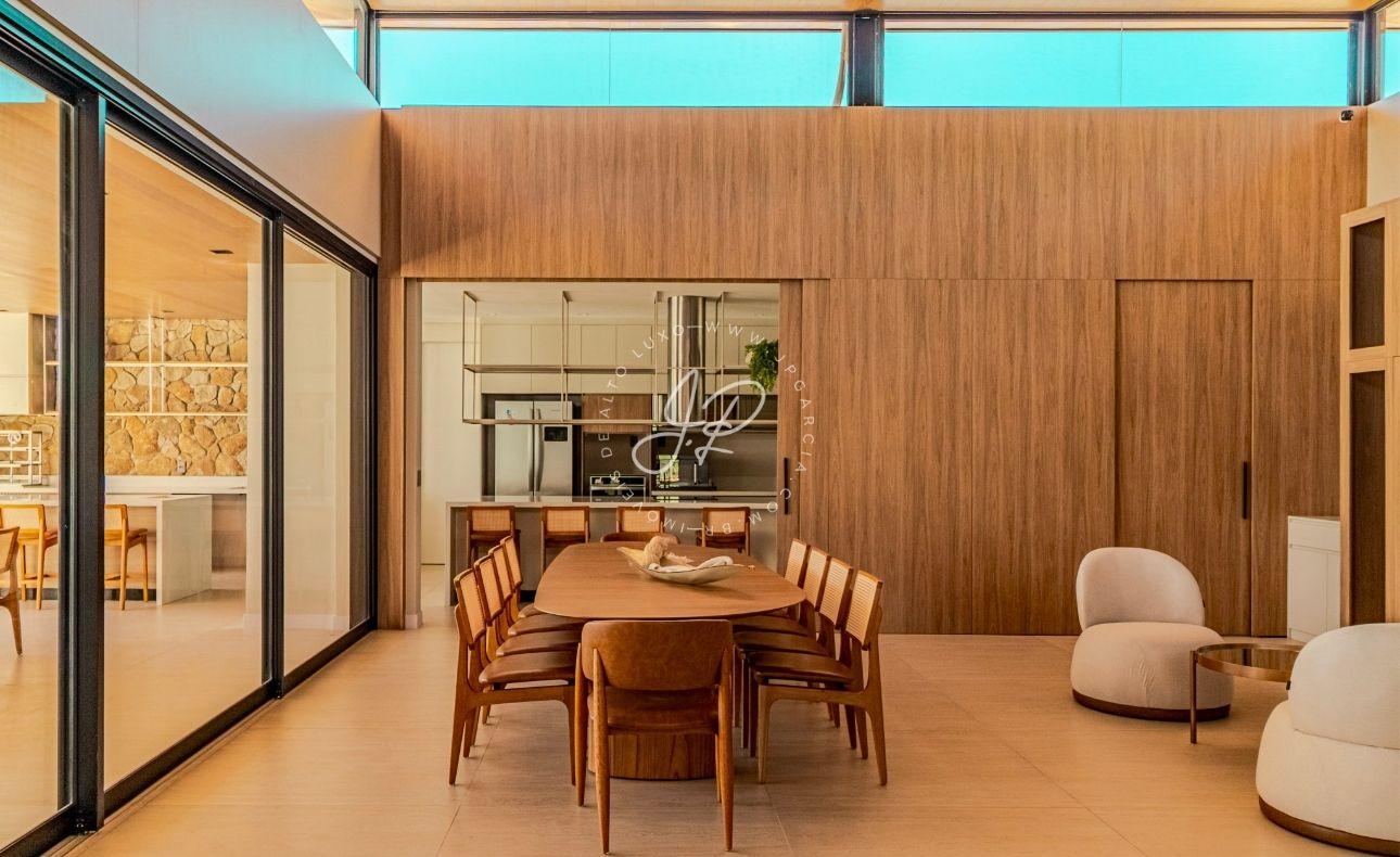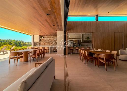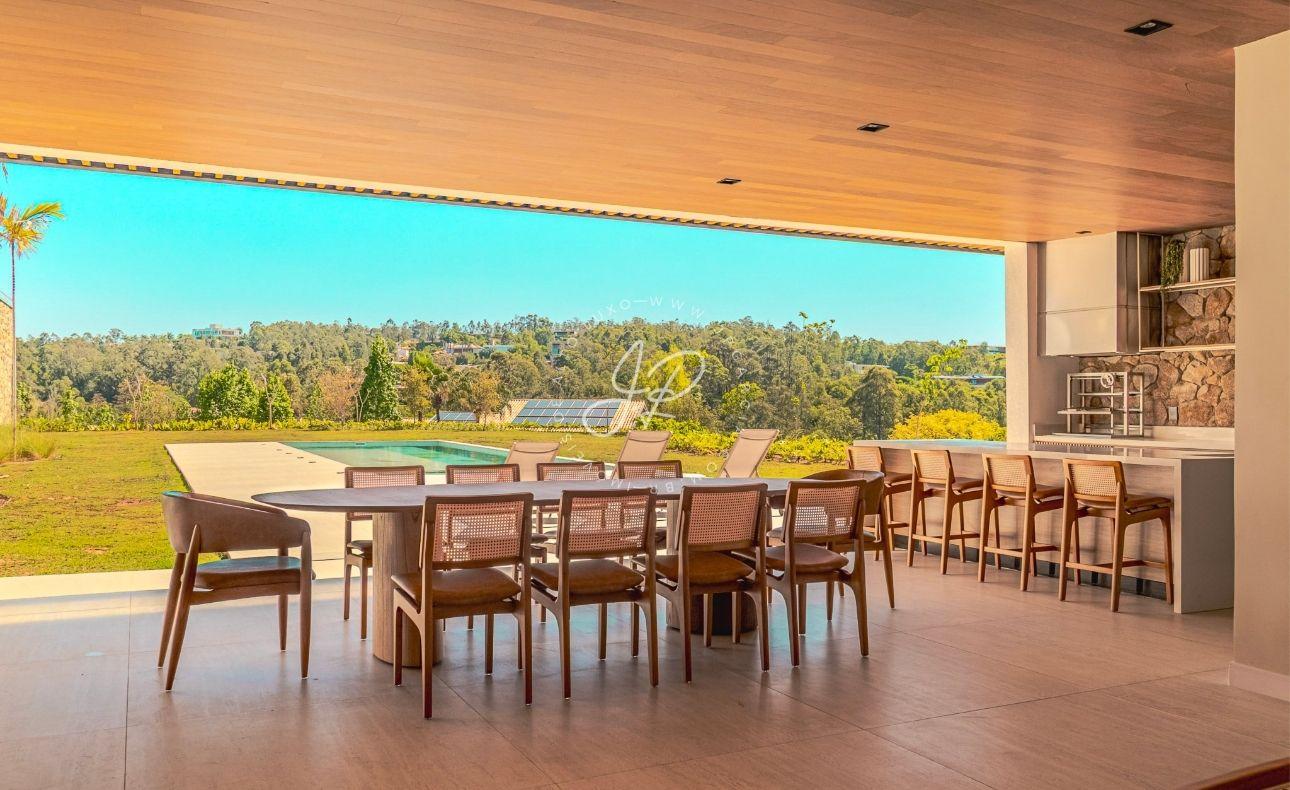 Ao entrar, a vista para o verde e o paisagismo de Roberto Riscalla já encantam. O hall possui pé-direito duplo e acabamento em madeira, criando um ambiente acolhedor. A casa conta com adega climatizada para mais de 300 garrafas, cozinha e espaço gourmet que podem ser integrados ao living e à sala de jantar, ideais para receber com naturalidade.