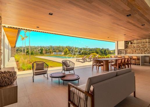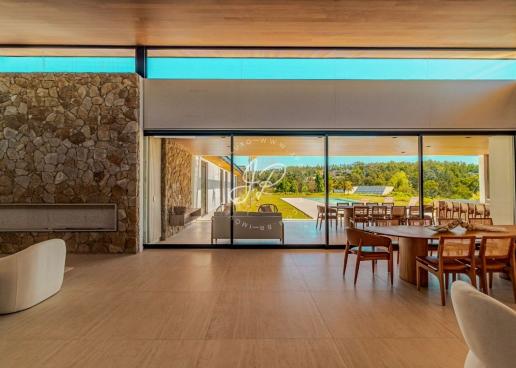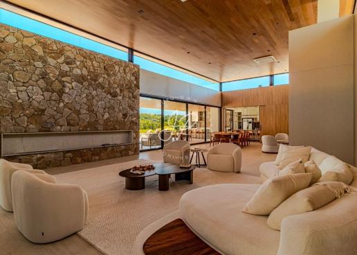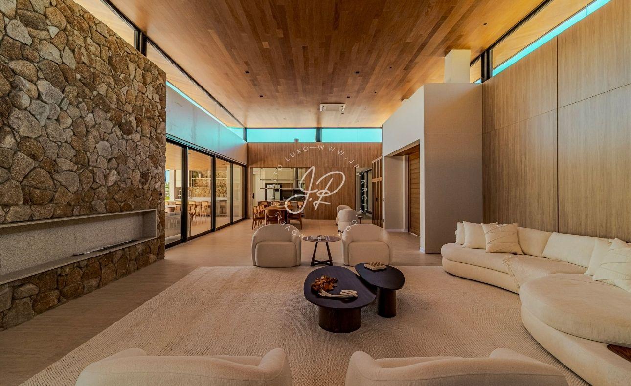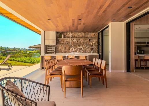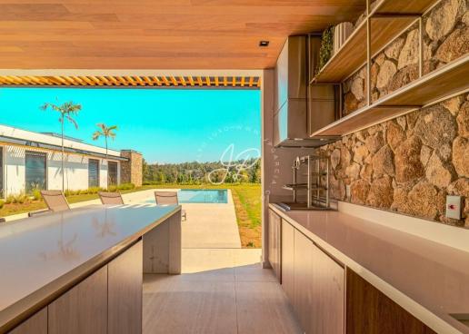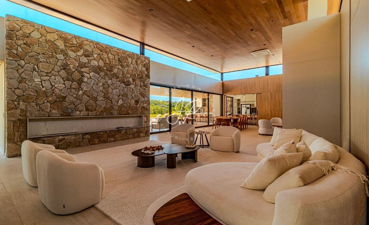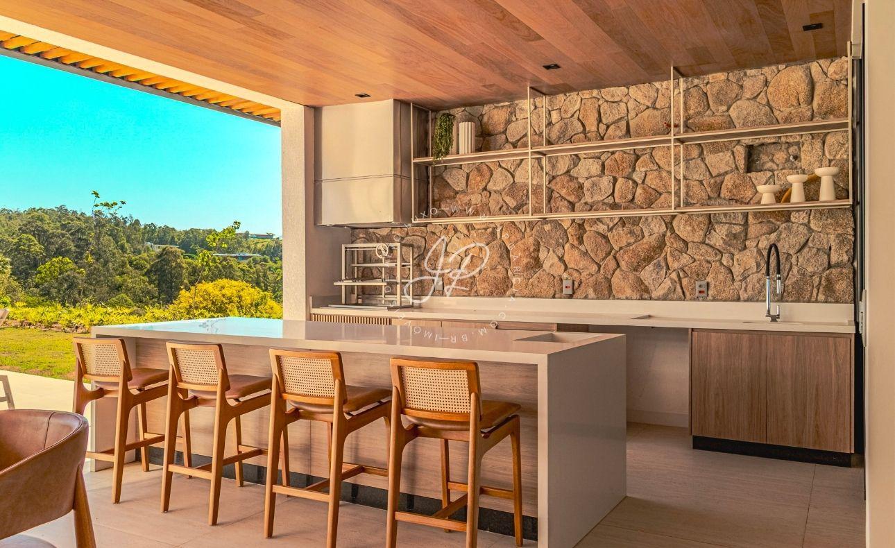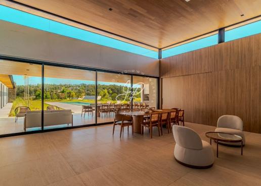 Ao entrar, a vista para o verde e o paisagismo de Roberto Riscalla já encantam. O hall possui pé-direito duplo e acabamento em madeira, criando um ambiente acolhedor. A casa conta com adega climatizada para mais de 300 garrafas, cozinha e espaço gourmet que podem ser integrados ao living e à sala de jantar, ideais para receber com naturalidade.