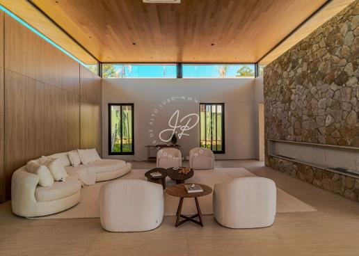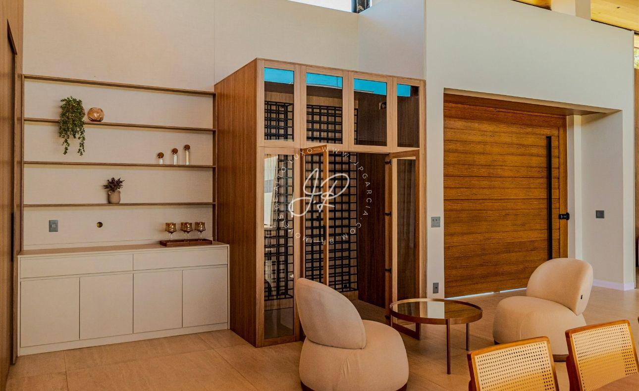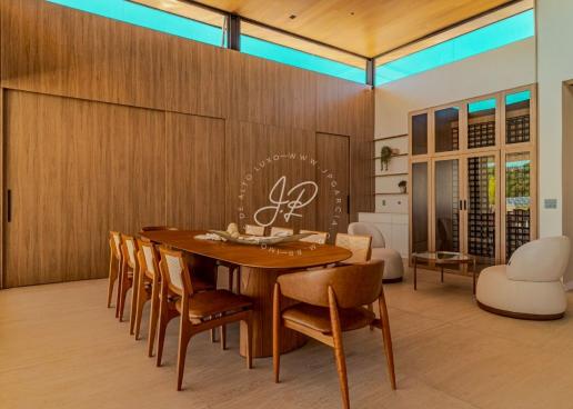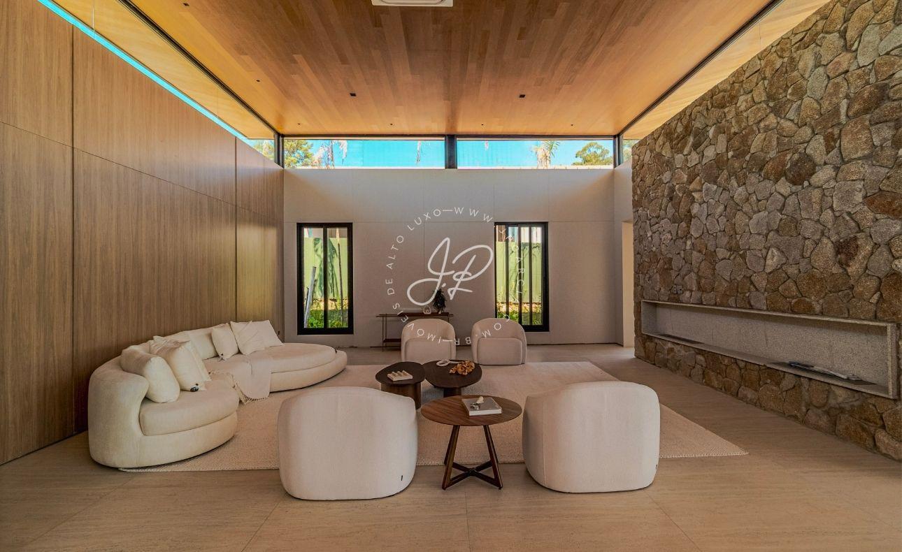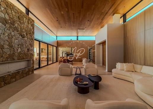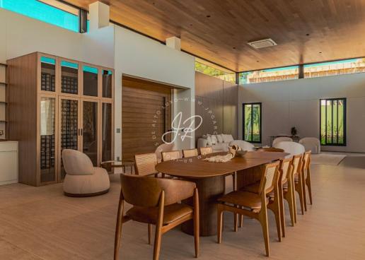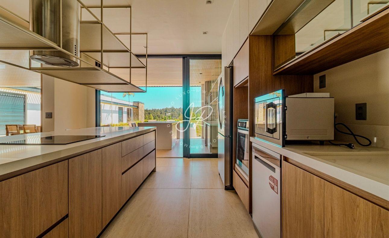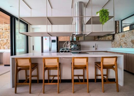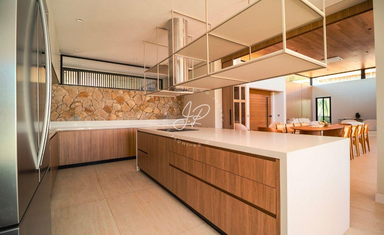 Ao entrar, a vista para o verde e o paisagismo de Roberto Riscalla já encantam. O hall possui pé-direito duplo e acabamento em madeira, criando um ambiente acolhedor. A casa conta com adega climatizada para mais de 300 garrafas, cozinha e espaço gourmet que podem ser integrados ao living e à sala de jantar, ideais para receber com naturalidade.