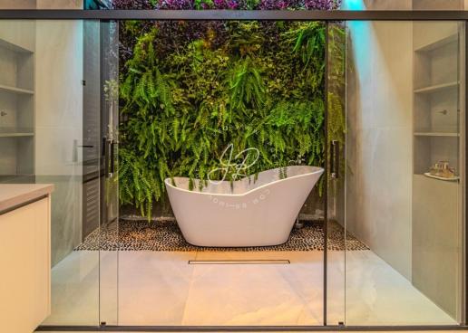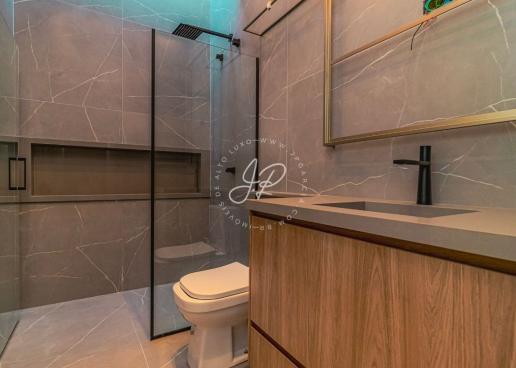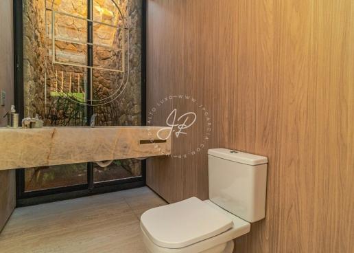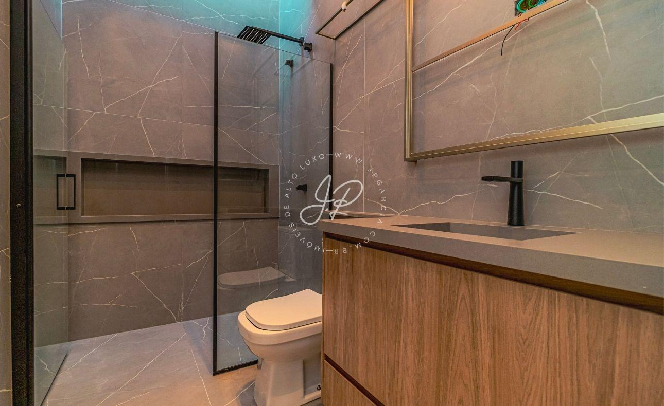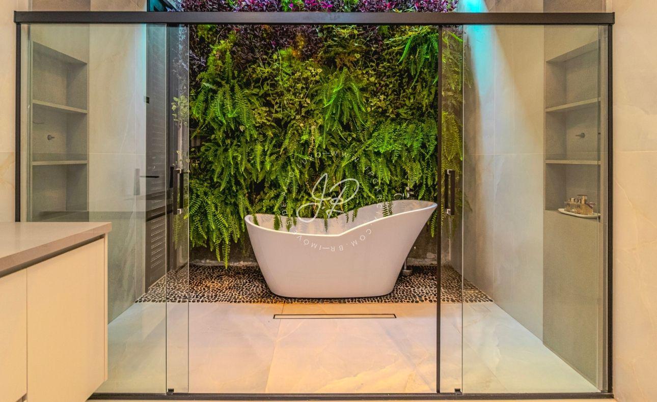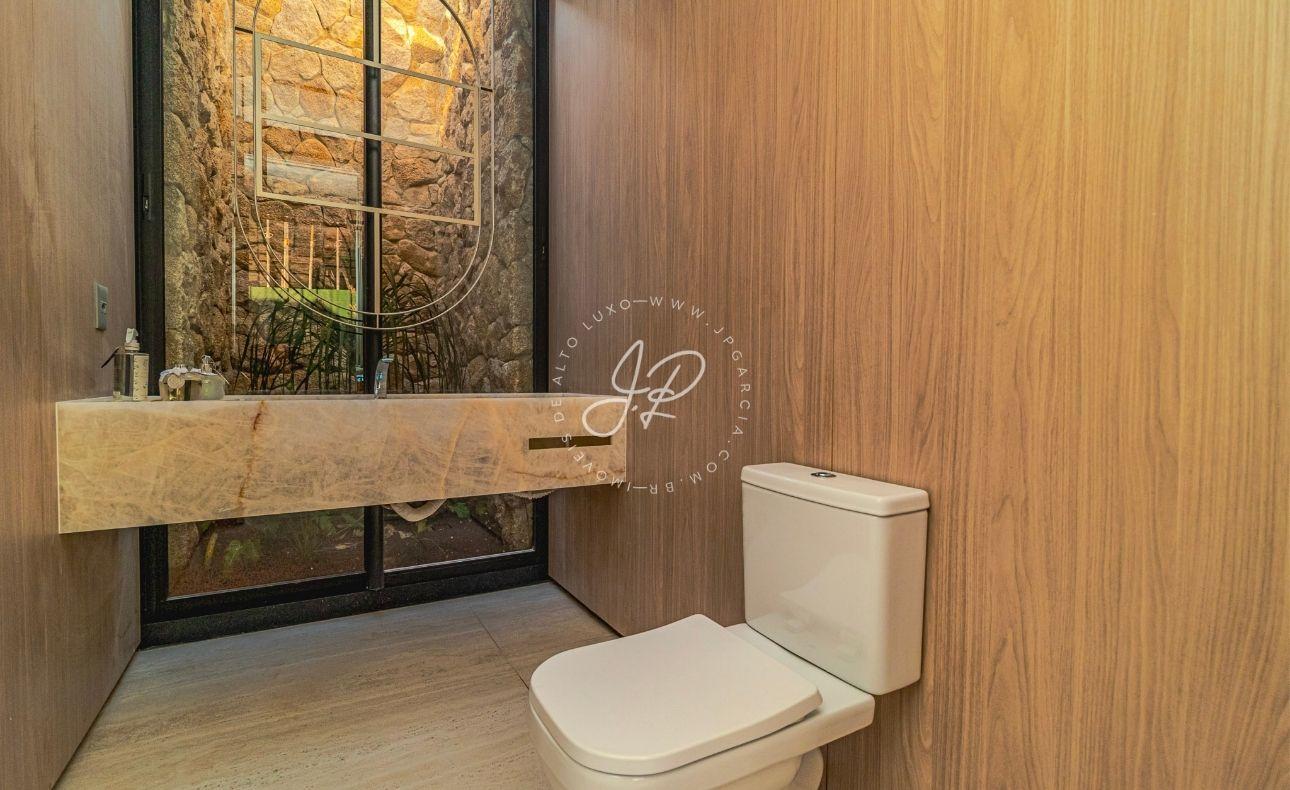 O lavabo, com pedra ônix iluminada e jardim privativo, reforça o cuidado em cada detalhe.