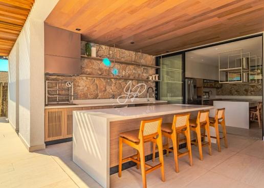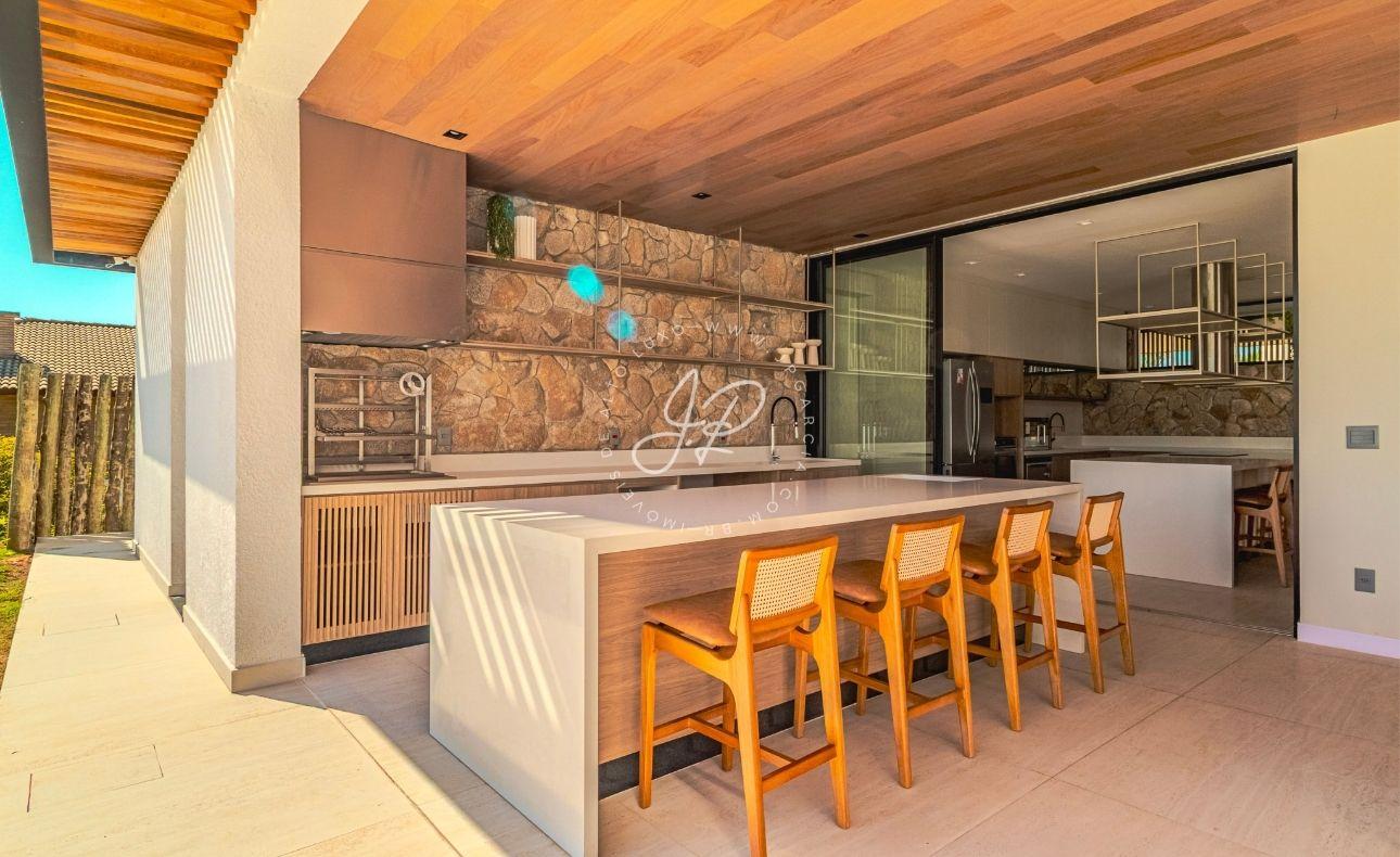 A área externa oferece piscina, jardim e integração total ao espaço gourmet com sistema de som — perfeita para momentos de lazer.
