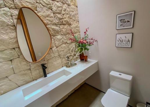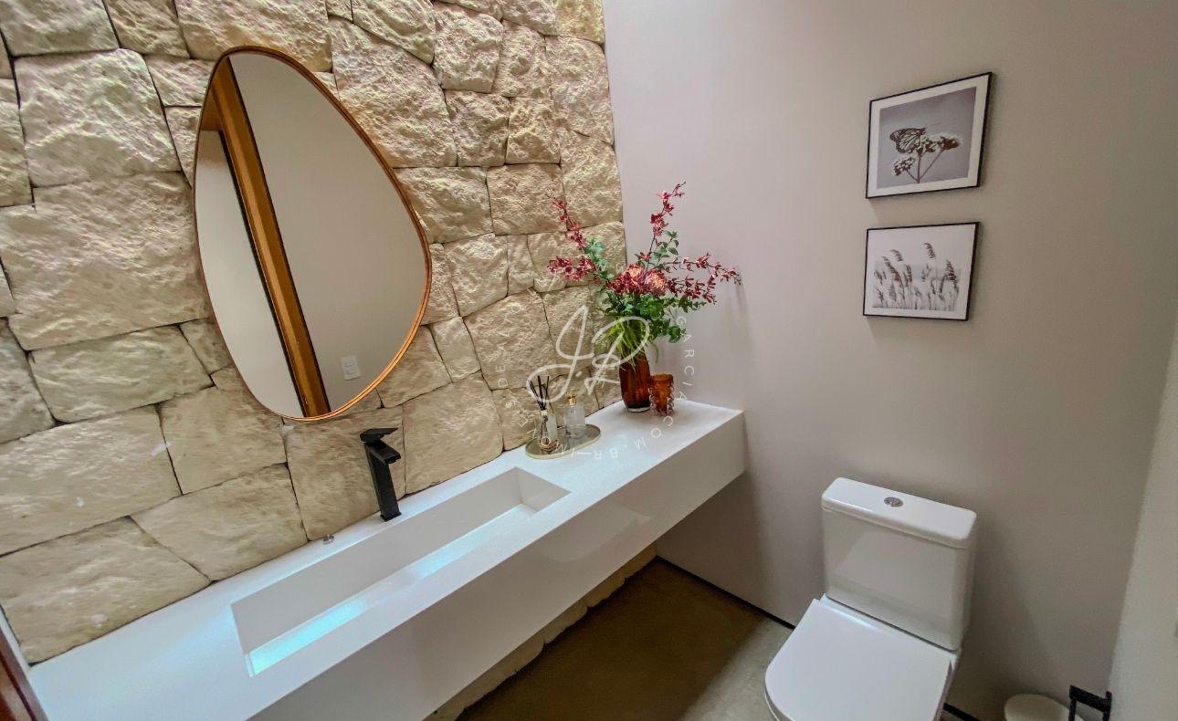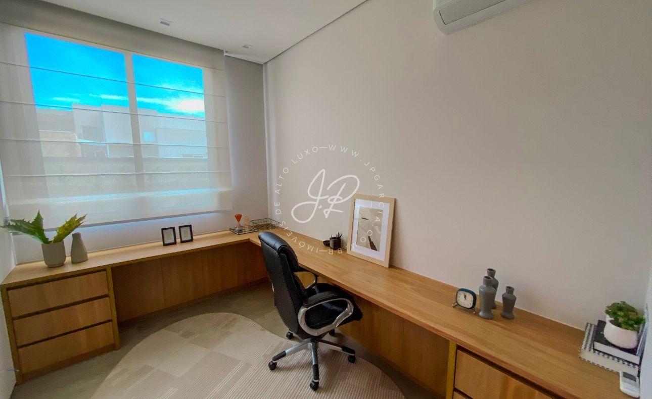 Na área íntima, a casa oferece 4 suítes amplas, todas com closet, garantindo privacidade e bem-estar. O imóvel conta ainda com 2 lavabos, escritório, sala de TV, roupeiro de apoio, além de despensa, área de serviço, varal e espaço para guarda de objetos.